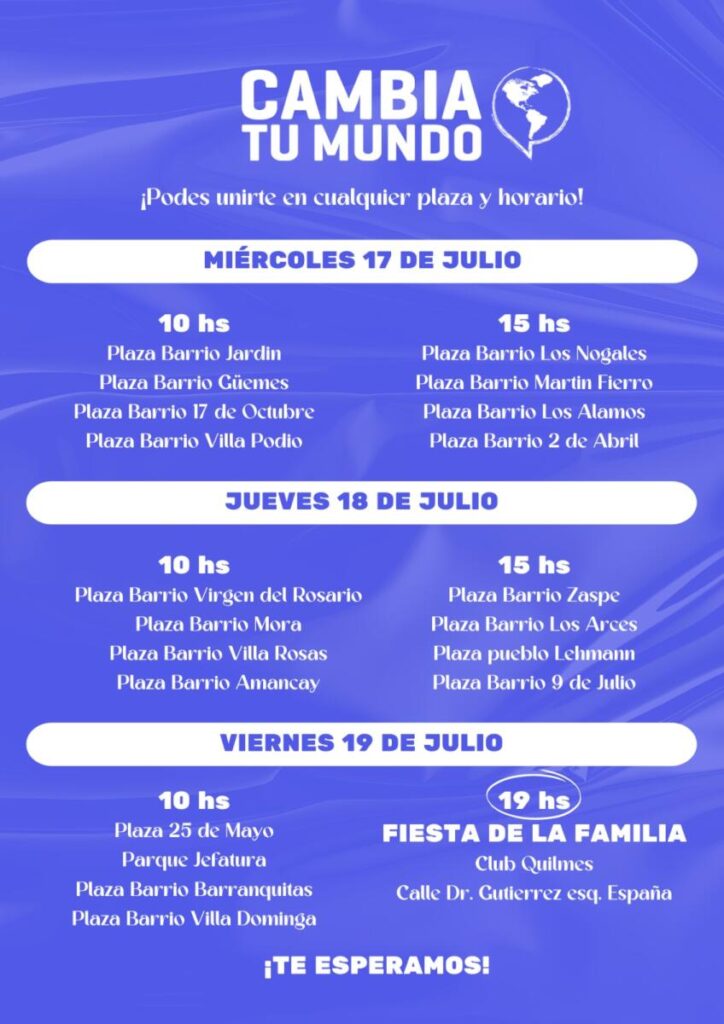 Para esta actividad participarán 250 voluntarios oriundos de Buenos Aires junto a gente de nuestra ciudad desde el miércoles 17 al viernes 19 de julio, en plazas y playones de distintos barrios (20 intervenciones), donde realizarán juegos y dinámicas para chicos, habrá payasos, reparto de alimentos, entrega de ropa, peluquería, gente de oficios, médicos, odontólogos, entre otros. Lo más importante es que esta tarea es acompañada de un mensaje de esperanza y paz.